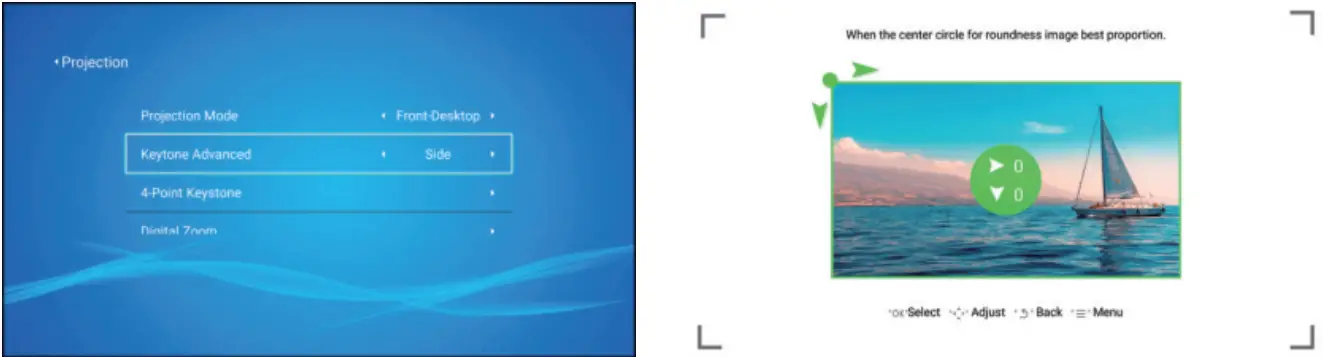 - Step 2: Select the Projection image setting interface, press OK to enter, select [Side] in the [Keystone Advance] column, then press the down button on the remote control to switch to manual keystone correction, and press OK to enter the four-point adjustment display interface.