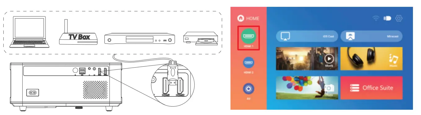 - Step 2: Press and hold the source button of the projector or remote control to enter the input source interface, or use the button to select HDMI on the main interface of the projector.