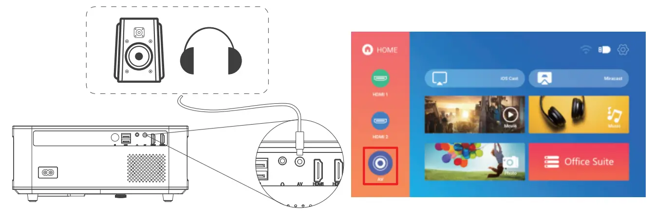 - Step 3: Select AV, press OK to enter, press Return to exit and return to the main interface of the projector.