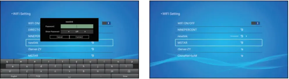 - Step 3: Select the WiFi name that needs to be connected, press the OK button to display a virtual keyboard, after using the remote control to enter the password, place the control cursor on the keyboard Donej, and press the OK button to complete the password input (Connecting the mouse to enter the WiF password is more convenient)