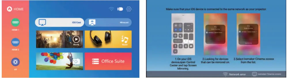 - Step 2:Open the projector home menu, use the remote control to select iOS Cast, press OK to enter the interface.