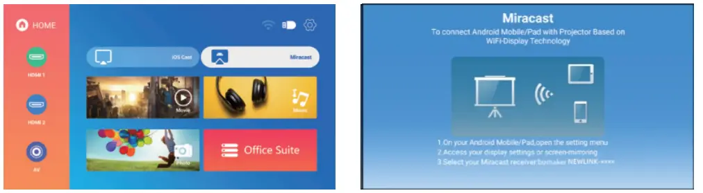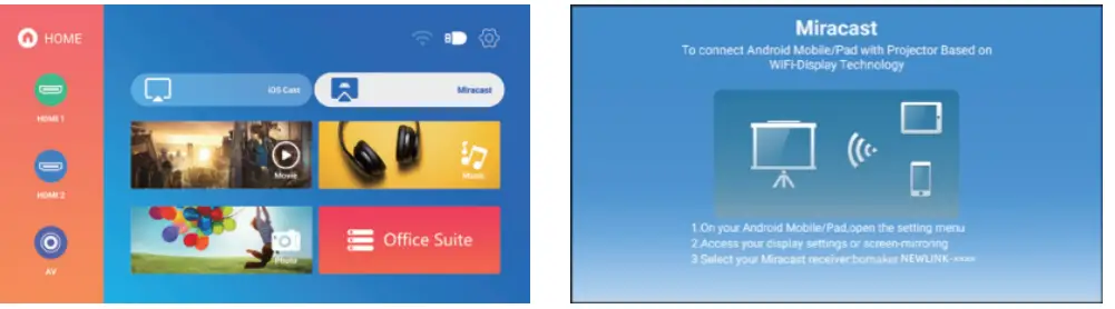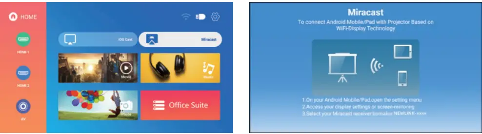 Note: There is no need for your Android device and the projector are connected to the same WiFi. - Step 2: Open the projector home menu, use the remote control to select Miracast, and press OK to enter the interface. Miracast HOME To connect Android Mobile/Pad with Projector Based on WIFHDINoley Technclog E office Suite 10n your Andoid Mobile Pat.ooen he sang meNu ZAccest for display settings.ar eeemiog