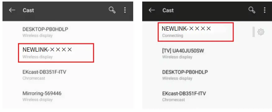 - Step 3: Select the “Wireless Display” option on your Android device, select the current projector name: NEWSLINK-XXxx, click and connect.
