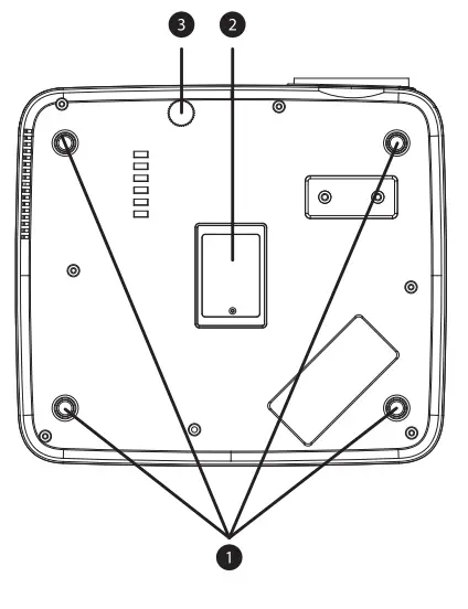 - Remove the four rubber pads on the button of the projector.you will see the screw holes and use the M5 11mm screws for installing the ceiling, and then install it.