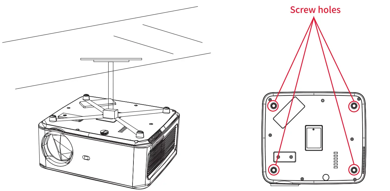 - If you have a projector screen that need to be mounted on a ceiling, the projector cannot be higher than the upper edge of the screen, otherwise, it will affect the image effect.