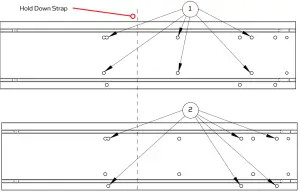 – Pattern 2: Alternate 4″ bolt pattern commonly used. NOTE: If pattern 2 is to be used, the right side plate must be removed to access the mounting holes in the bow plate. - Install hold down strap between the motor and deck of boat between second and third set of mounting holes.