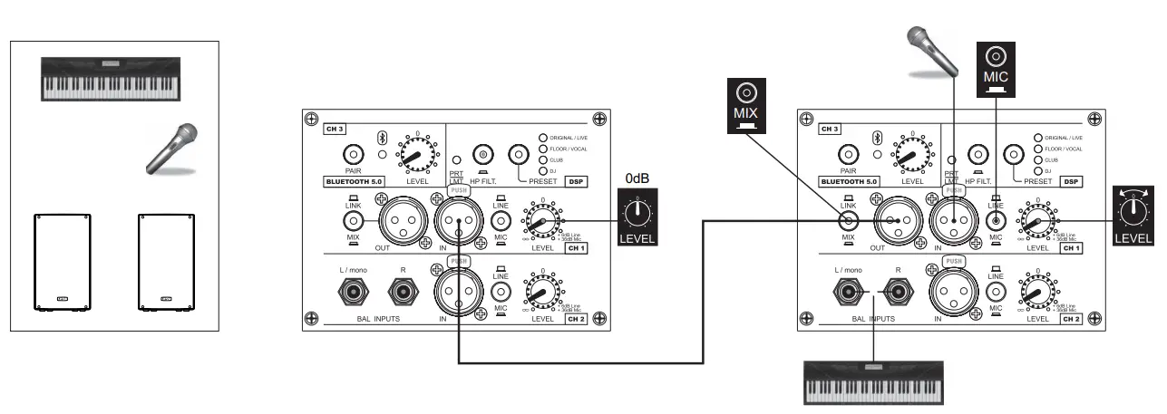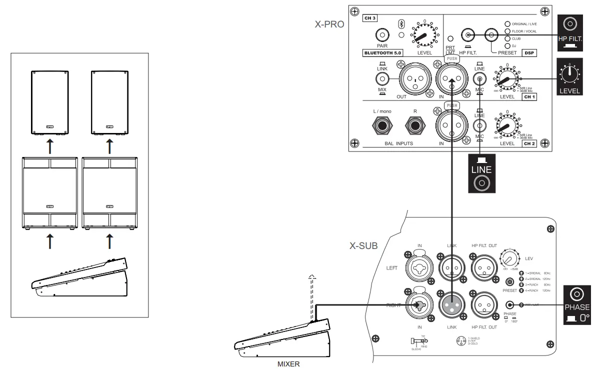 Configuration with two speakers, subwoofers, and mixers respectively. You can also connect the mixer to the X-PRO speaker input and relaunch the output to the subwoofer by setting the button on the LINK.
