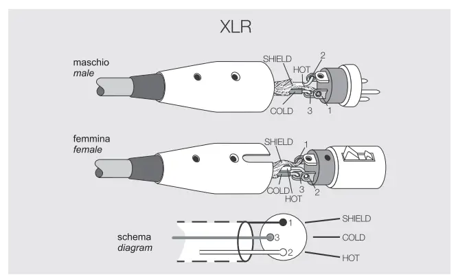 The 3-pole XLR connectors are almost always used for conducting mono-balanced signals; the three poles correspond respectively to the ground (1), the positive signal (2) and the negative signal (3).