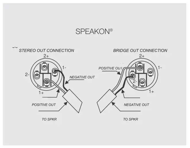 SPEAKON is a connector that is specially adapted for connecting power terminals to loudspeakers; when inserted in an appropriate socket it locks so as to prevent accidental disconnection; moreover, it is equipped with protection against electrical shocks and guarantees the correct polarization