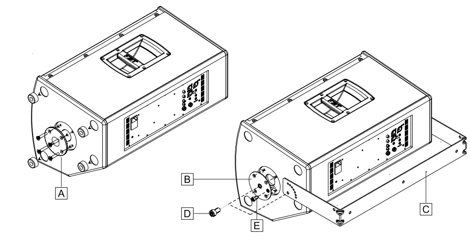 - Use the other M6 cylinder-head screw (E) for orienting the speaker as preferred