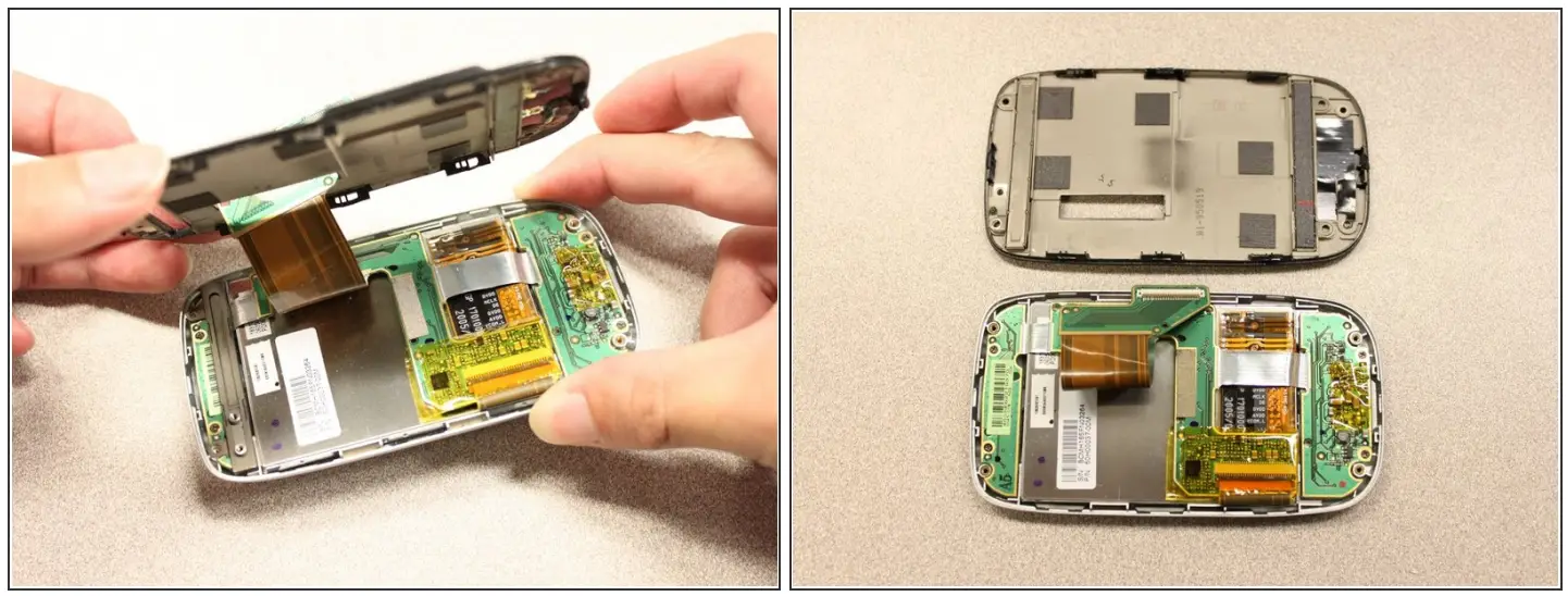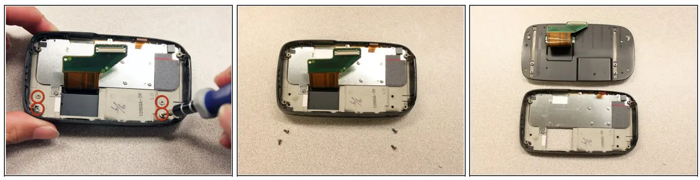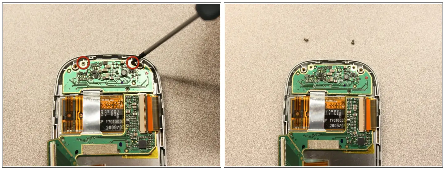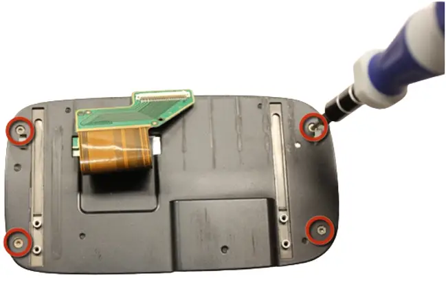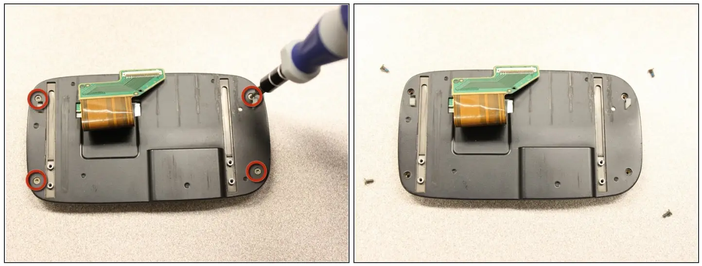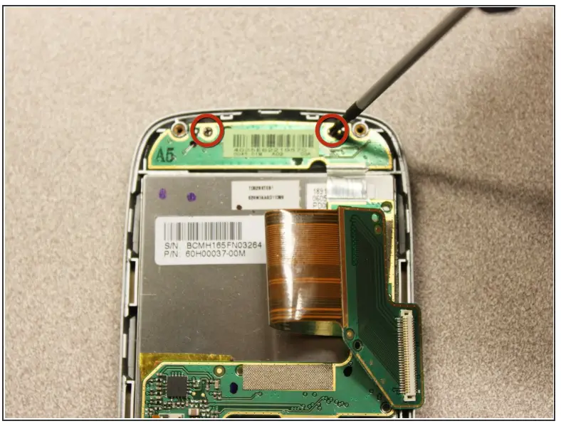 - Unscrew the two 3mm phillips #0 screws from the top of the device that secures the rigid-flex board to the screen panel.
