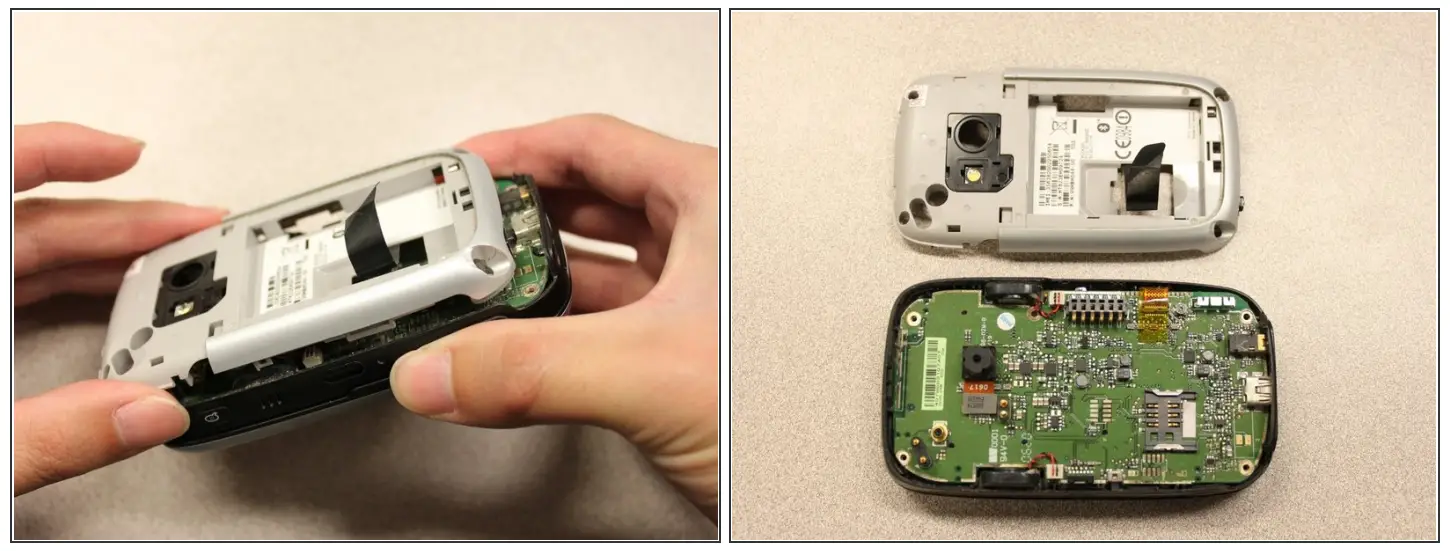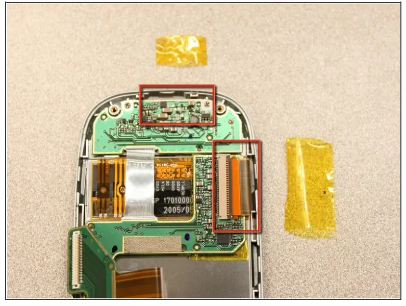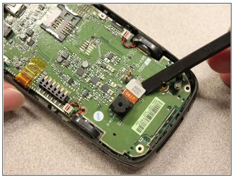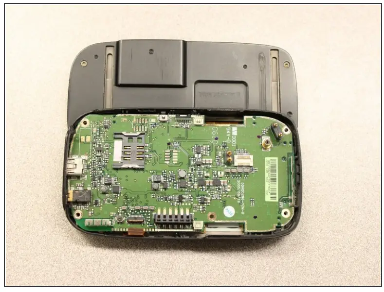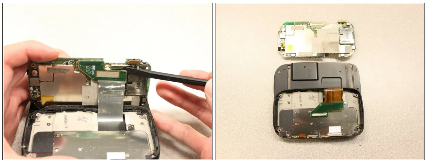 - Unscrew the two 3mm phillips #0 screws from the top of the device that secures the rigid-flex board to the screen panel.