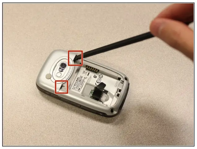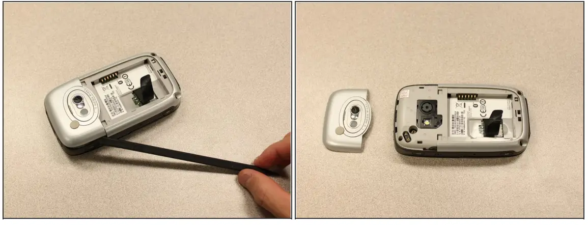 - Insert the flat end of the spudger into the two notches on the back of the camera cover and pry them up.