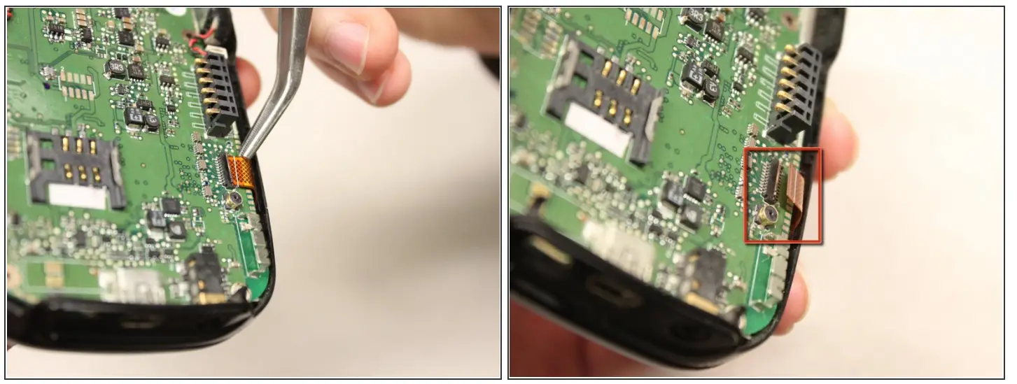- Unhinge the flexible connection and use the tweezers to disconnect.