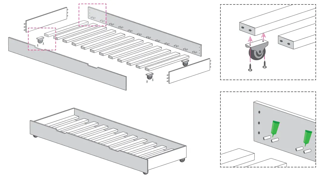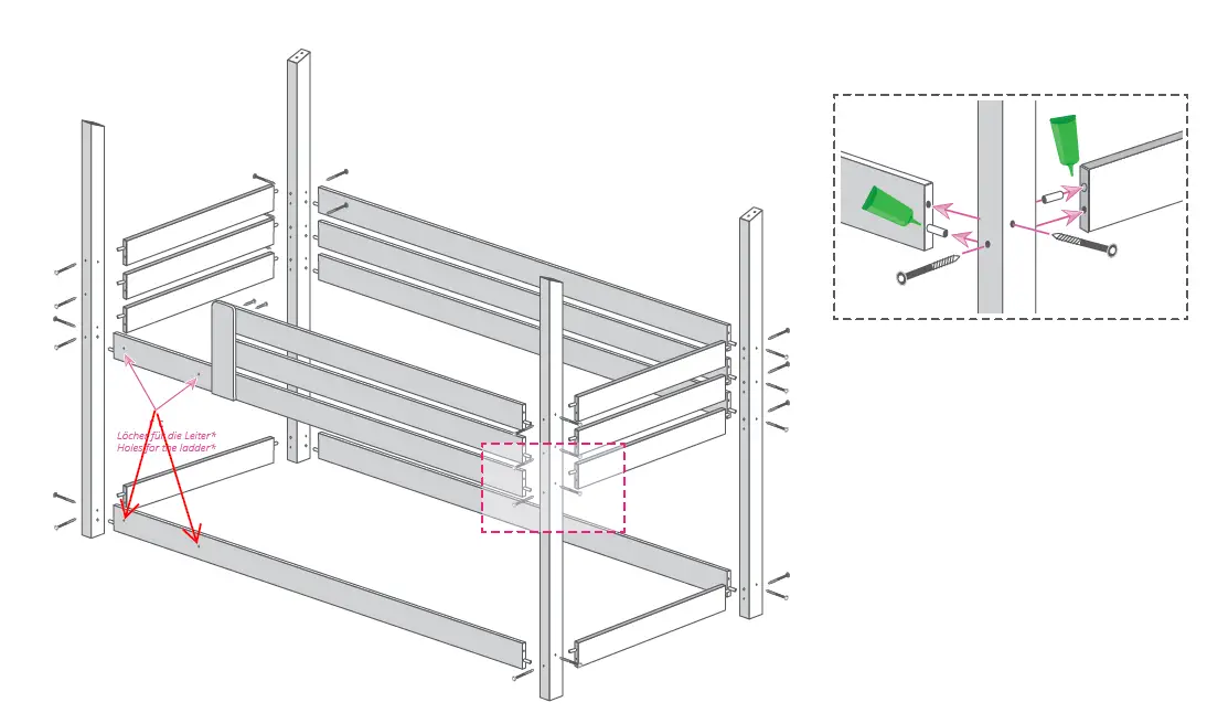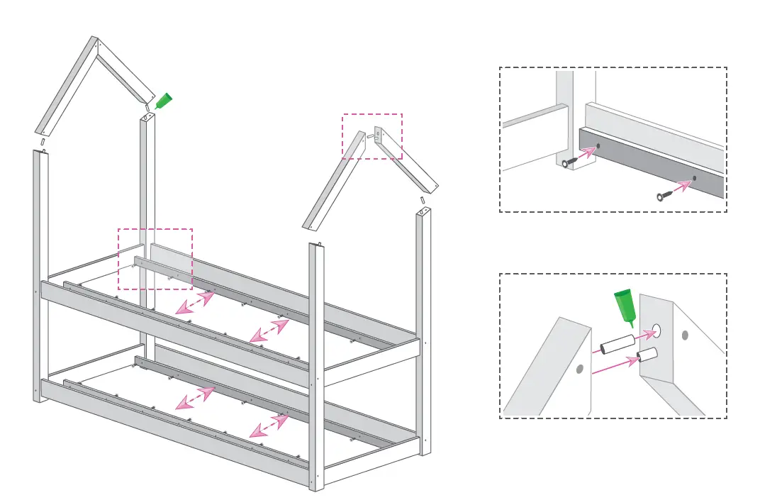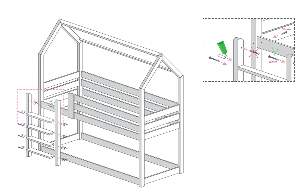 You will find small green glue tubes with EU standards. Just slide a small amount of glue into the holes to receive the wood dowels. Glue is only necessary at the level of beveled wood stud assemblies for perfect stability. It is not necessary to put glue on the bed base which would prevent you from dismantling the bed afterward.