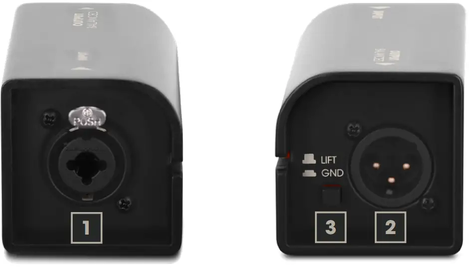 - LIFT / GND Switch for disconnecting the ground connection from the input and output (ground lift). In the non-pressed position, the ground connection is disconnected; the connection is established when the switch is pressed. The ability to prevent a humming loop using the ground lift switch depends on the grounding of the connected device. It is therefore possible that the switch is able to effectively reduce or eliminate humming when it is either up or down, depending on circumstances.