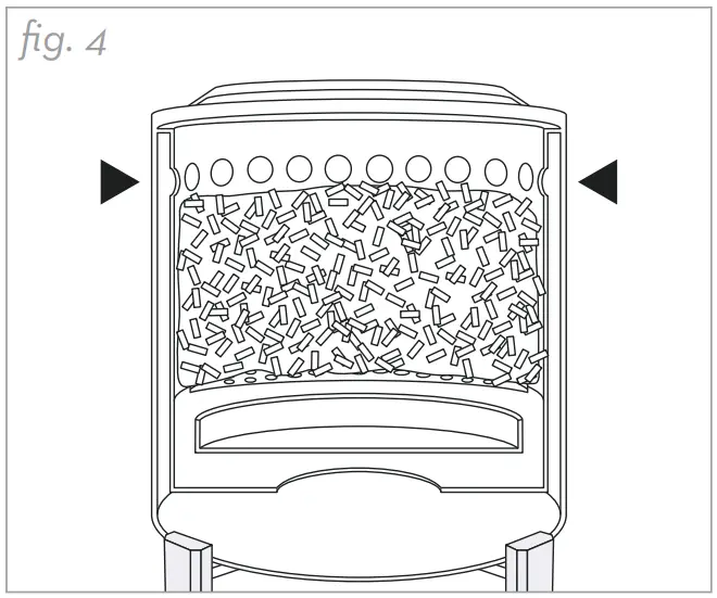 - Add pellets to the burn chamber until they are resting right below Mesa XL’s interior vent holes. Never add pellets higher than Mesa XL’s interior vent holes. Doing so will cut off airflow and cause your fire to smoke. (fig. 4)