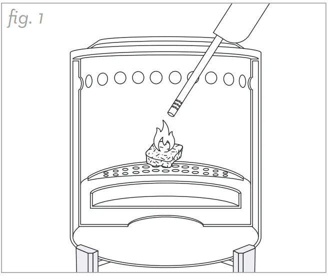 - Use a long lighter to light the fire starter. (fig. 1)
