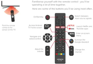 Follow the on-screen set-up prompts to pair voice-enabled remote with the TV, connect the TV to the internet, sign in to Google Account and tune TV channels.