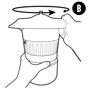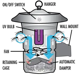 Flying mosquitoes are attracted to the unit by the UV light. The fan then pulls the mosquitoes into the screened base, trapping them until they dehydrate and die. The base can be removed, allowing the contents to be periodically emptied into the trash. The see-through screen shows the mosquitoes trapped in the compartment, alerting you when the cage needs to be emptied.