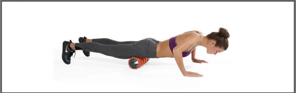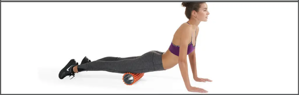 Lie on stomach with body straight, toes on floor with arms bent and hands on floor under shoulders. Position roller just below hips under front of upper legs.