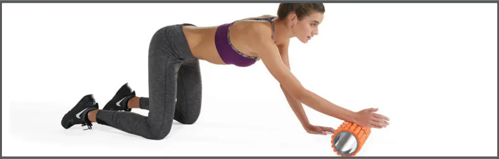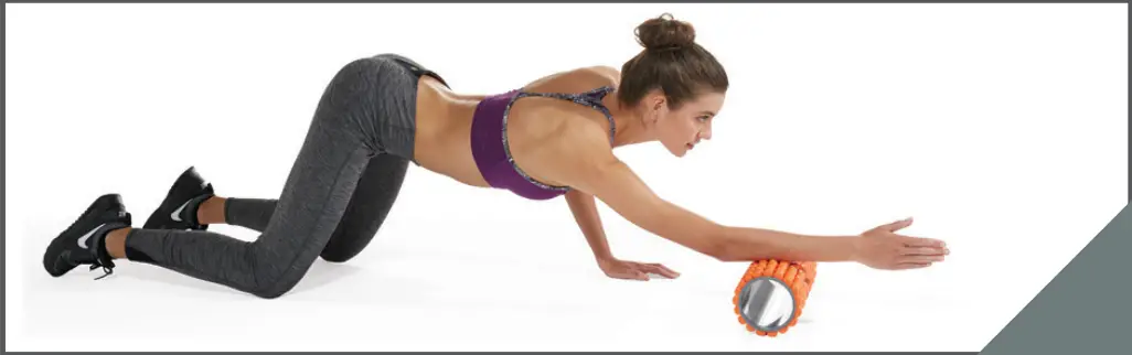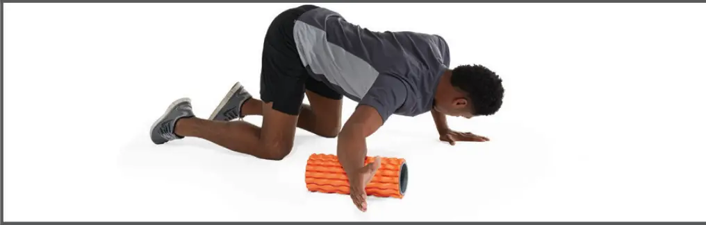 Straighten bent arm, shift weight forward and lower chest toward floor while gently pressing and rolling forearm across top of roller with thumb pointing upward. Feel shoulder and back stretch. Return slowly to start position and repeat.