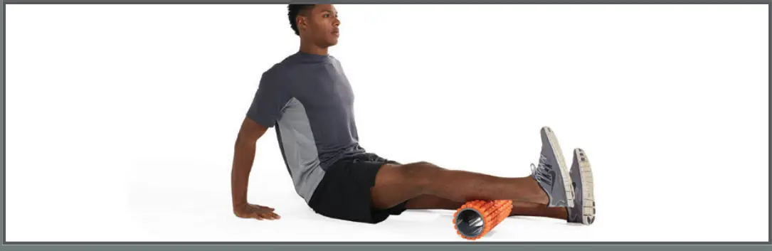 Sit with back straight, hands on floor positioned under shoulders with arms extended supporting upper body. Bend one leg; straighten opposite leg and position roller just above knee under back of upper leg with heel off floor and toes pointed forward.