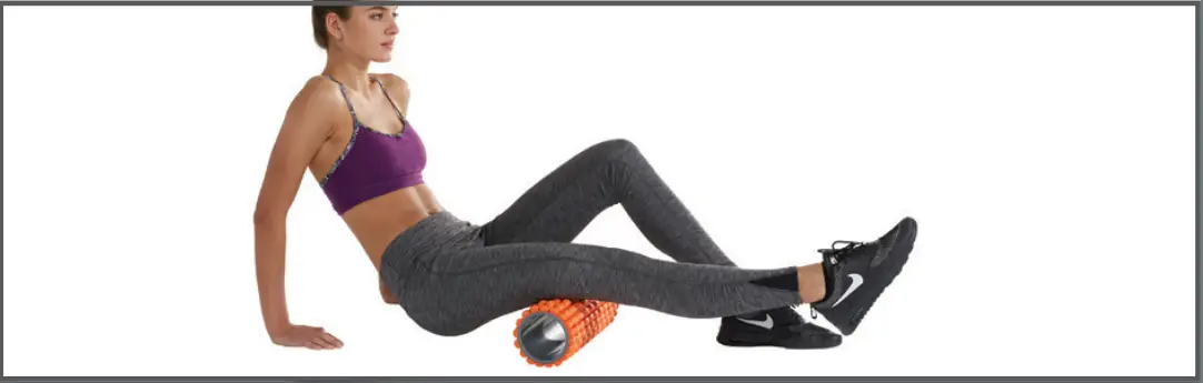 Sit with back straight, hands on floor positioned slightly behind shoulders with arms extended and supporting upper body. Straighten one leg; bend opposite leg and position roller just above ankle under back of lower leg with heel on floo.