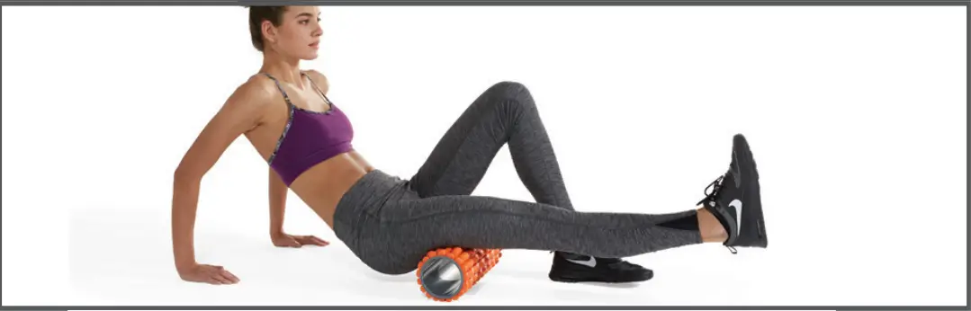 Press hands downward while raising buttock slightly off the floor. Straighten bent leg, raise heel off floor and pull toes backward while pressing and rolling lower leg across top of roller. Return slowly to start position and repeat.