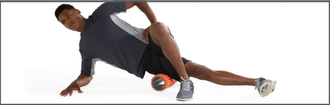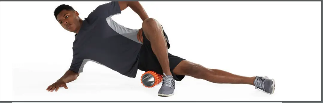 Lie on side with body straight, bottom arm bent with elbow on floor under shoulder supporting upper body. Bend top arm and leg and place foot flat on floor in front of bottom leg. Straighten bottom leg and position roller just below hip under side of upper leg with foot slightly off floor and toes pulled backward.