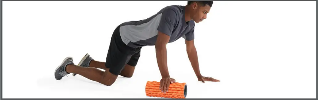 Kneel with knees under hips, lower legs and feet on floor, and back straight. Straighten one arm and position hand on floor slightly in front of shoulder with opposite arm bent, side of hand on top of roller with thumb pointing upward.