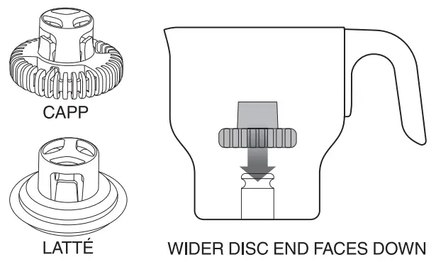 - Select the ‘Capp’ or ‘Latté’ frothing disc. Choose the ‘Capp’ disc for thick and creamy froth or the ‘Latté’ disc for smooth and silky milk