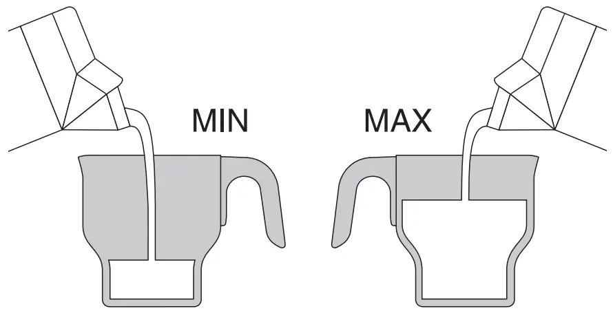 - Do not operate the appliance without liquid. Always fill to at least the ‘MIN’ marking and no more than the ‘MAX’ marking inside the jug.