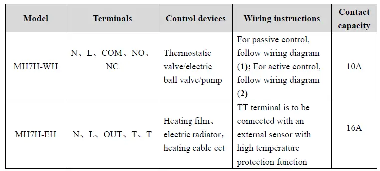 Note:” If MH7 thermostat do not connect with an external temperature sensor, it will only display” the indoor temperature icon; If MH7 thermostat connect with an external temperature sensor, it” will display the indoor temperature and high temperature protection icon; When it is under high” temperature protection, high temperature protection icon flickers.
