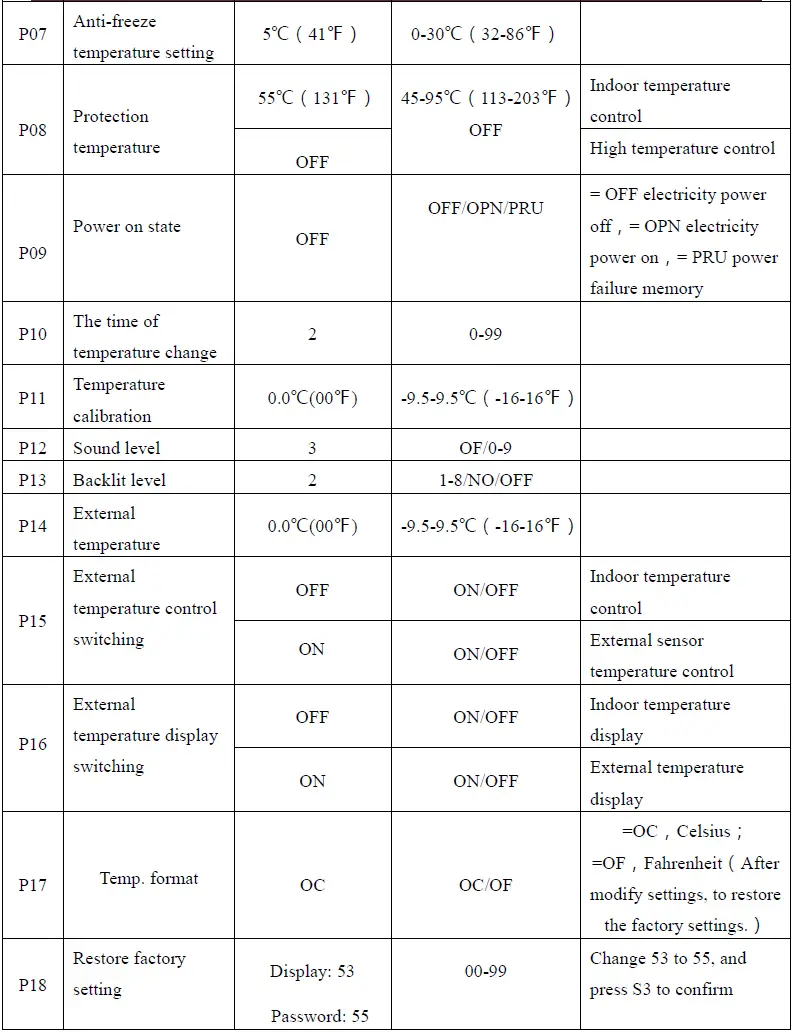 The setting range is 5-37 ℃(41-99℉). Then press S4 or S5 can adjust the value. Press S3 or wait” 25 seconds without any key operation will save the setting and return back to the normal operation” interface.
