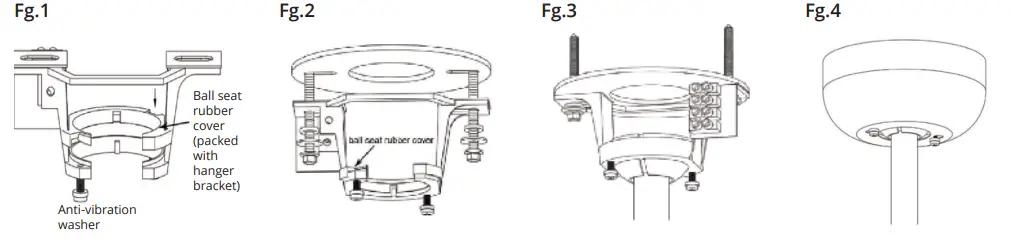 - Place circular shockproof gasket above the hanger bracket. Align the bracket and screw the hanger bracket to the ceiling tightly. (See Fg.2)