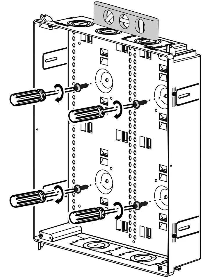 Mount to a plywood backboard using the pre-drilled mounting holes on the rear of the enclosure. The use of a level is recommended for correct installation of the enclosure.