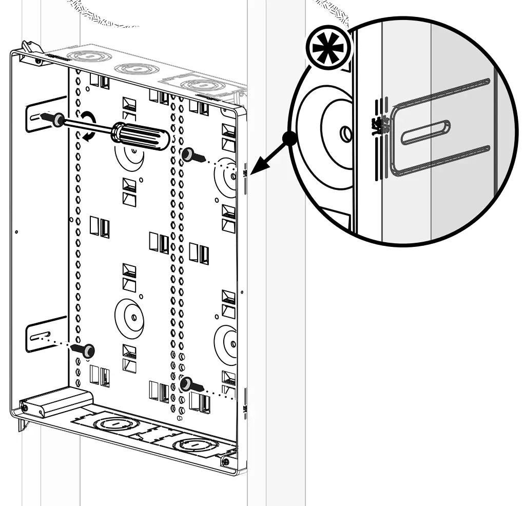 The Enclosure is designed to fit between a minimum 2×4 studded wall at 16”on-center (OC). If wall studs are greater than 16” on-center (OC) refer to Retrofit Installation. Position Enclosure between wall studs at appropriate depth (refer to drywall depth guide on enclosure ) and utilize four (4) drywall screws to secure to wall studs.