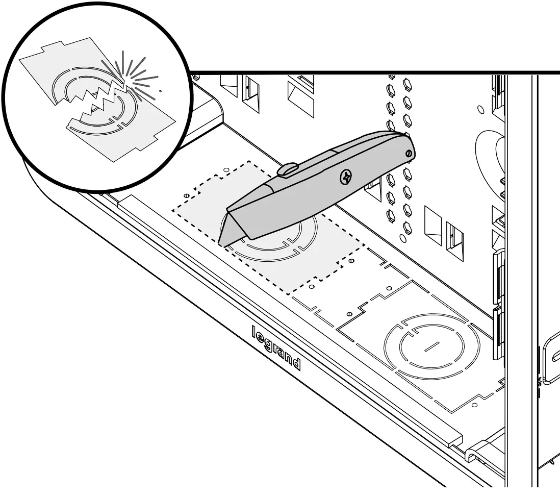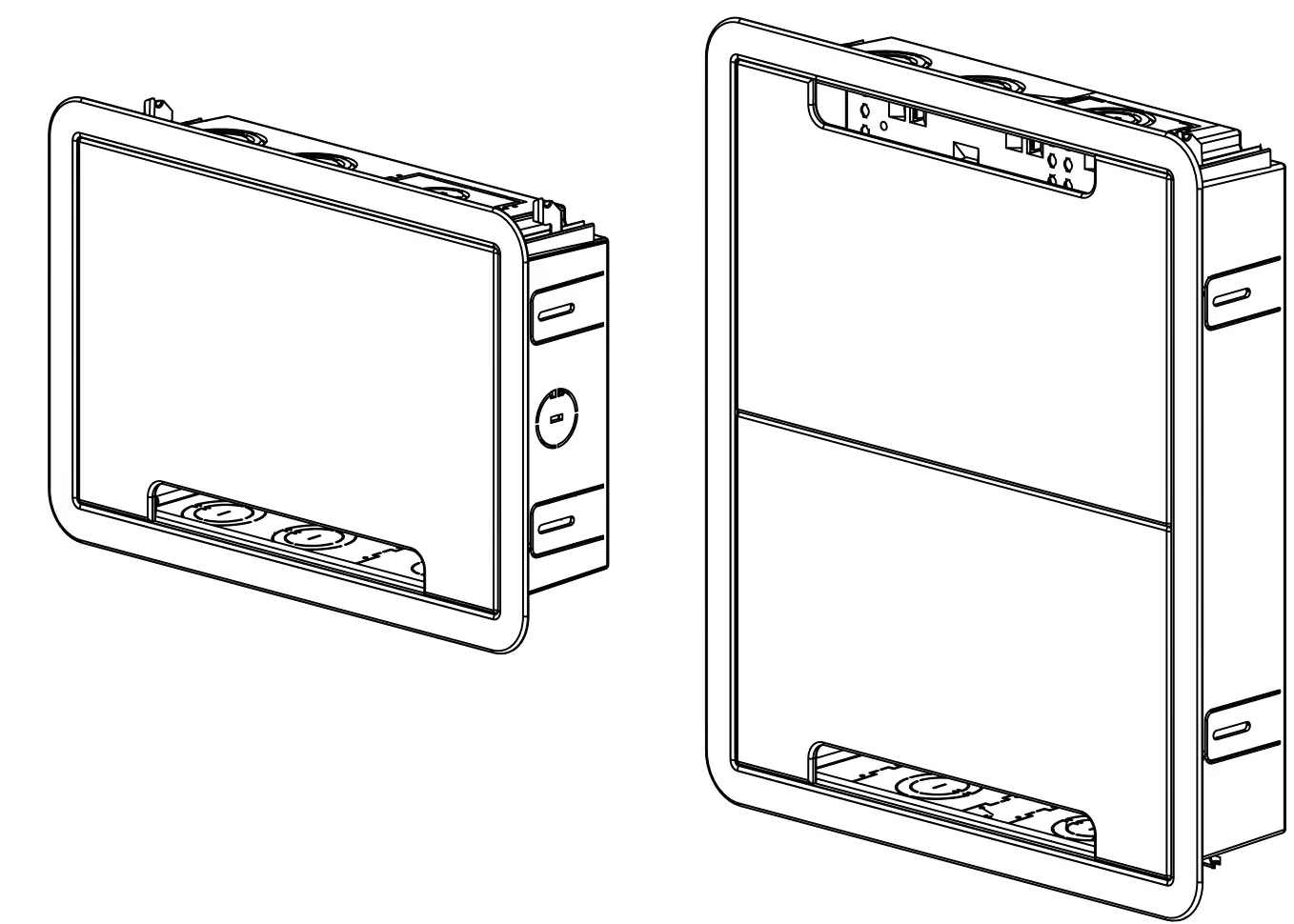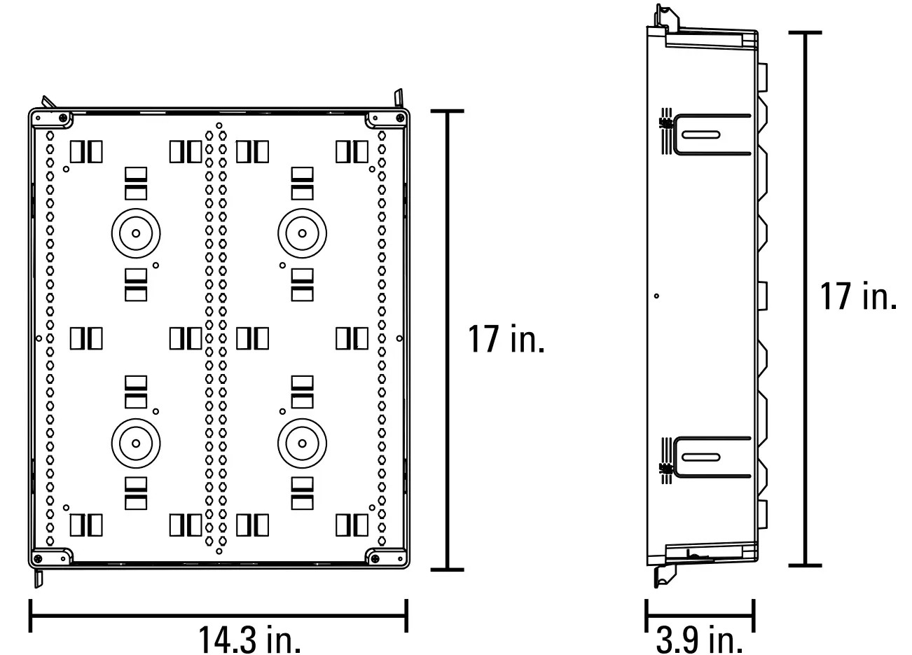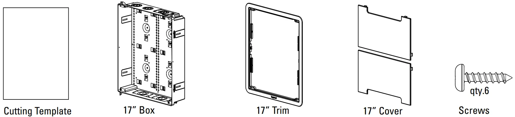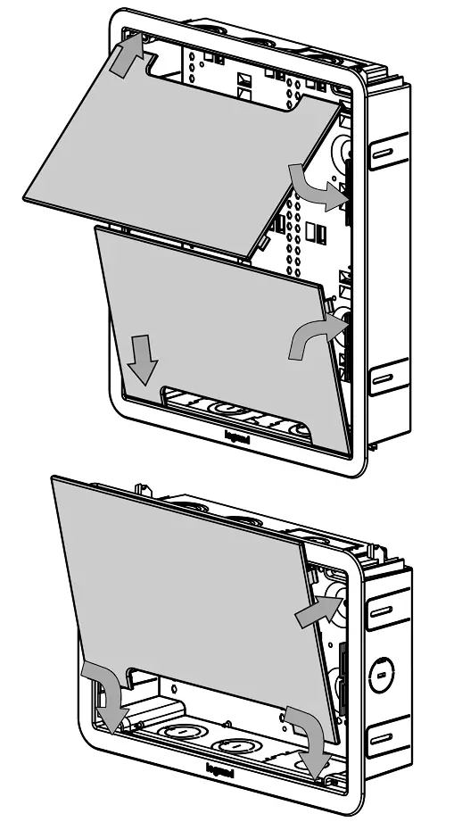To attach the cover, position cables exiting enclosure towards the pass-through opening and slide bottom tabs into receiving channels of trim ring. Push the sides of the cover into the locking side channels for a flush finish. The 17” model has two covers for easy access to contents, even when the enclosure is partially obstructed.