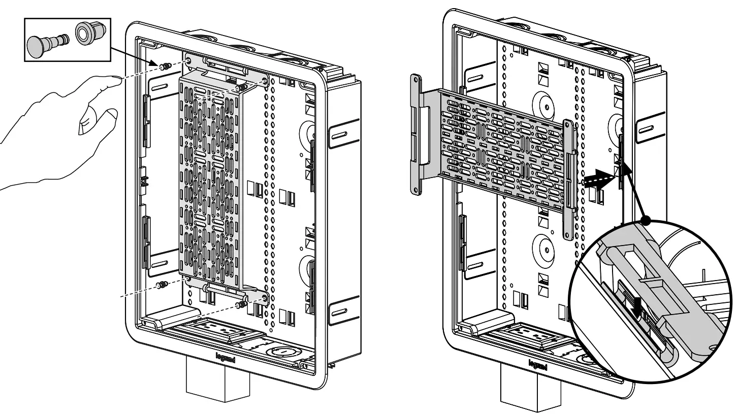 The removable component mounting bracket allows organization of devices before or after installation. If desired the bracket includes four (4) plunger / grommets to secure directly to back wall of enclosure – Vertical or Horizontal.