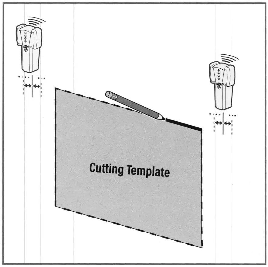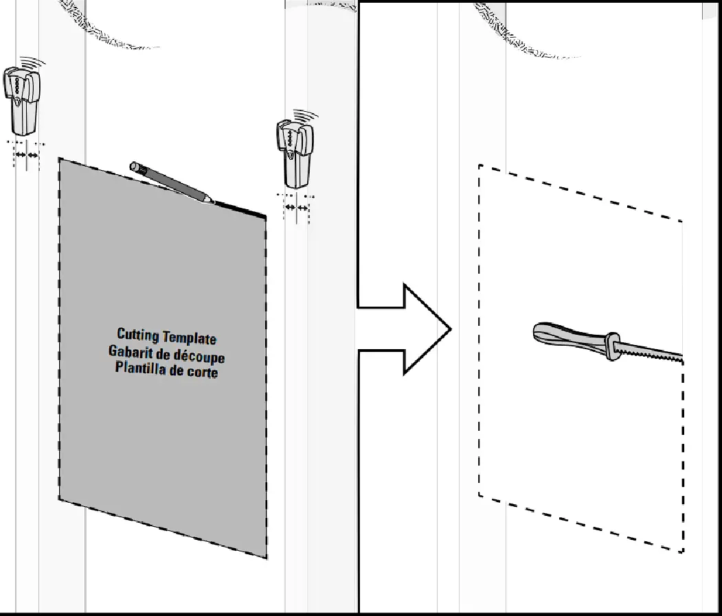 After desired height is identified, use a stud finder to locate the vertical stud locations. Place the cutting template against the wall surface and trace the outline. Use a drywall saw to cut the box outline.