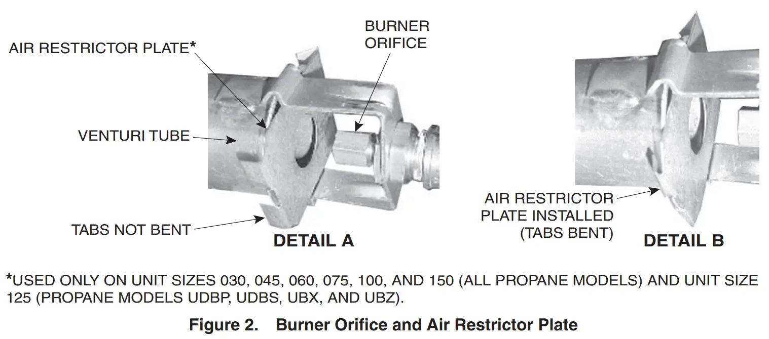 Do not attempt to drill burner orifice. Use factory-supplied orifice only f. Install replacement burner orifice (see Figure 2, DETAIL A).