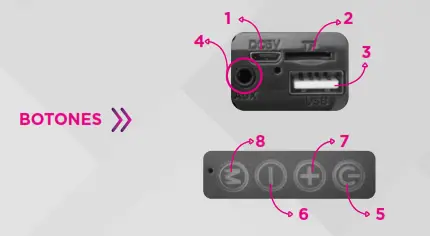 (ON/OFF). Mantenga presionado para encender/ apagar. Cuando este la música presionar una vez para play/pausa (solo funcione en modo USB/TF/BT/AUX) - Botón