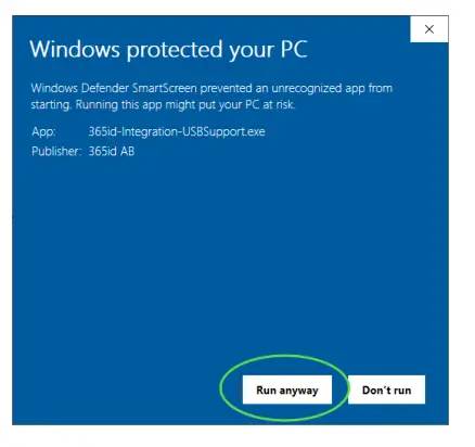 https://download.365id.com/download/integrations/365id-Integration-USBSupport.exe Run the installation program. You may be presented with a “Windows protected your PC” or a similar dialog. If so, click “More info”