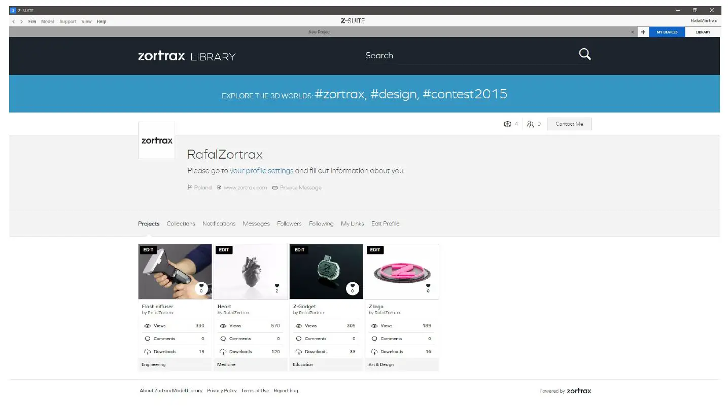 Click on the “Projects” tab to browse through your custom project you’ve added to the Zortrax Library. In order to edit or delete a project, click “Edit” and you’ll be redirected to the section where you can modify the project’s data or delete it permanently from the Zortrax Model Library.