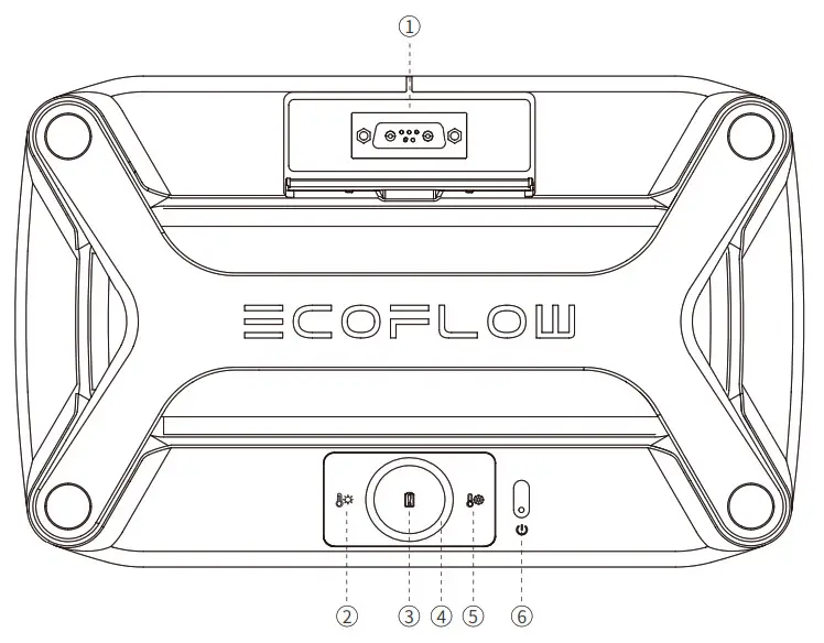 | 1. Expansion Power Port 2. High-Temperature Indicator 3. Battery Warning Indicator | 4. Battery Level Indicator 5. Low-Temperature Indicator 6. Power Button |