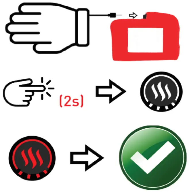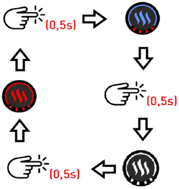 Make sure the battery is connected. Press the heating button for approx. 2 seconds. The button will flash red – blue – white. Press twice to heat. Press the button to switch the heating power. To switch off, press the heating button for approx. 2 seconds.