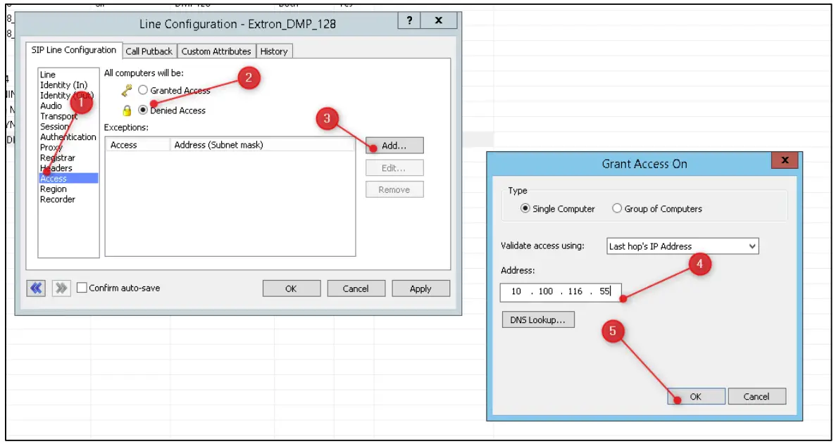 - Click on Access [1] followed by the Denied Access [2] radio button. Add the DMP Plus Series as an exception by clicking on the Add [3] button and entering its IP address [4], followed by OK [5].