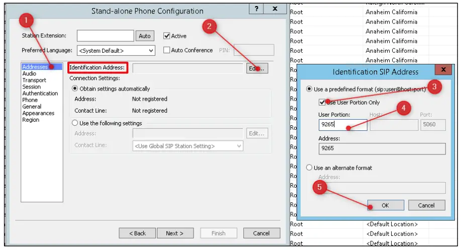 - Click Edit [2] from the Identification Address section of the Addresses [1] section. Select Use User Portion Only [3] and enter the extension number [4] assigned to the DMP Plus Series, followed by OK [5].