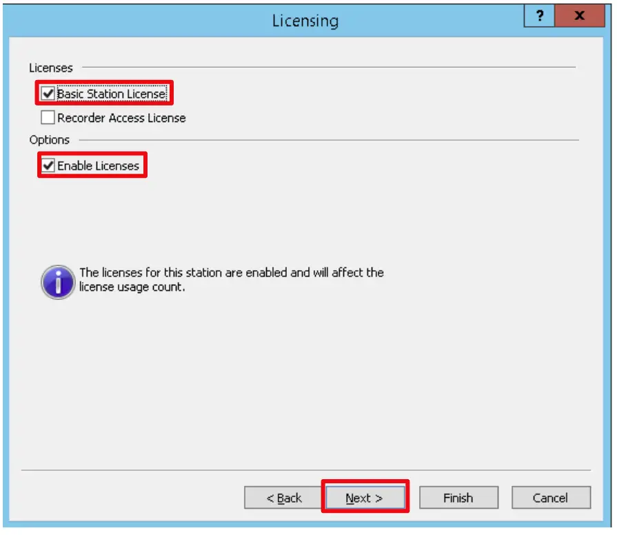 - Select the Basic Station License and Enable Licenses checkboxes followed by Next.